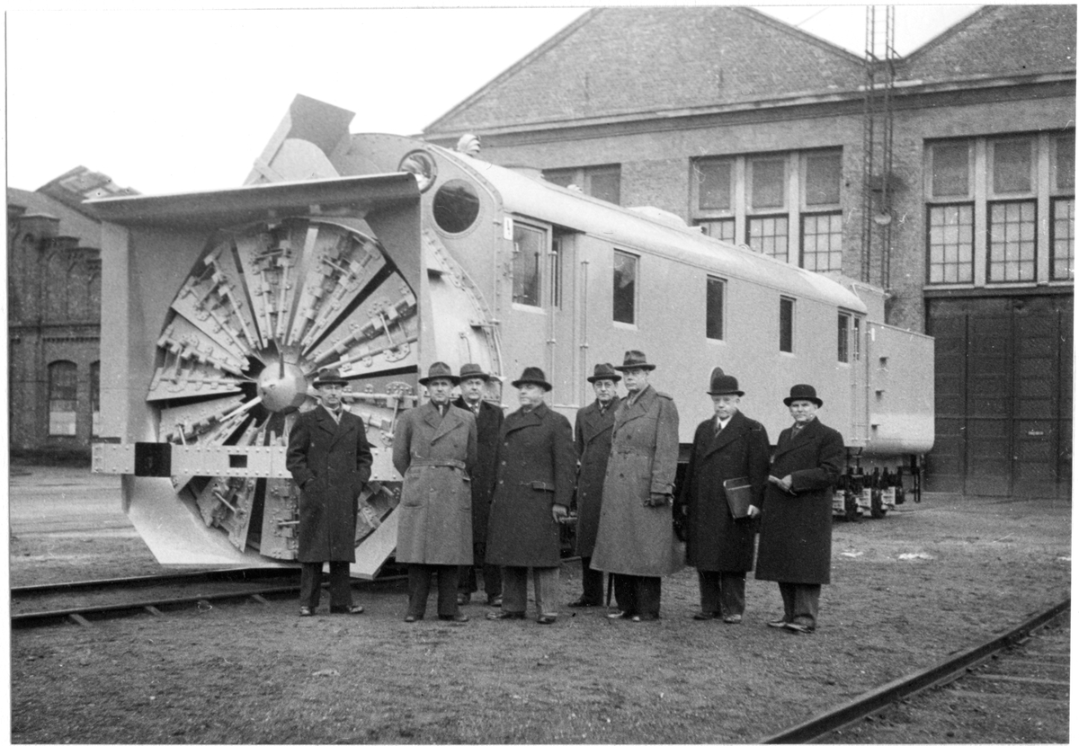 Vid Nydqvist & Holms mekaniska verkstad då en snöslunga levererades. Fjärde man från vänster generaldirektör Gustaf Dahlbeck, Statens Järnvägar.