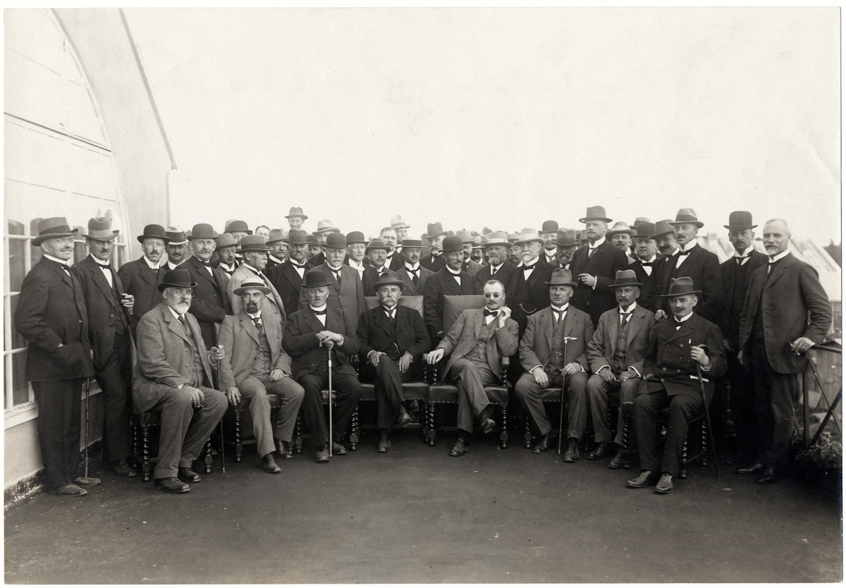 Gruppfoto taget vid AGA:s anläggning på Lidingö. Mannen i främre raden med mörka glasögon är AGA:s VD Gustaf Dahlén.