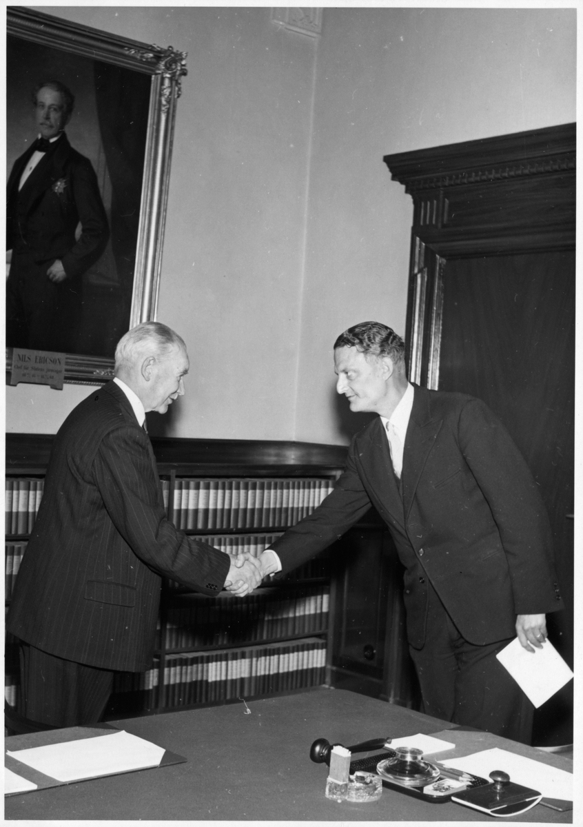 Byråchef Gunnar Fredrik Ruist avtackas av Generaldirektör Erik Gustaf Upmark. Statens Järnvägar, SJ.
