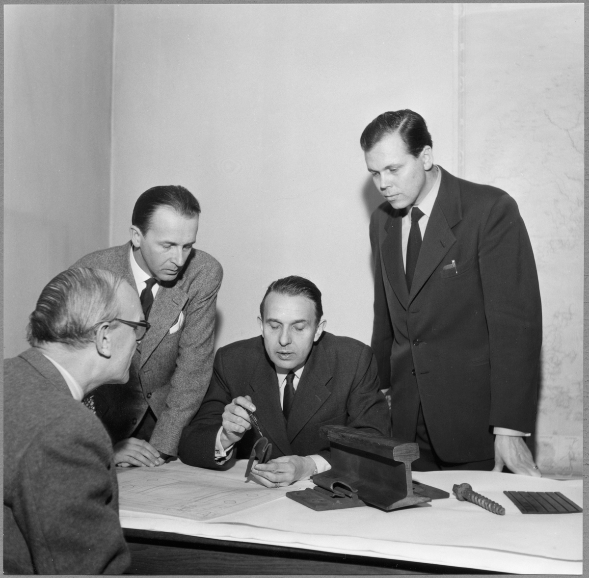 Byråingenjör Sven-Erik Schäder instruerar medarbetare i befästning av järnvägsräls.