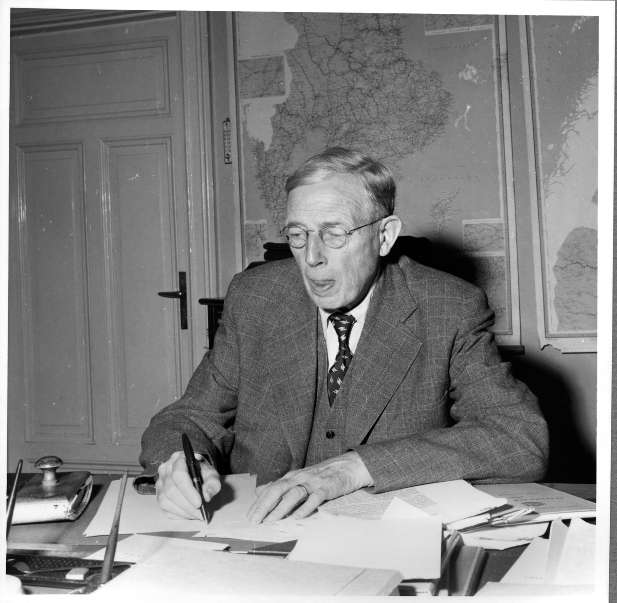 Titel: Byråchef Erik Malmkvist på sitt tjänsterum vid pensionsavgången.