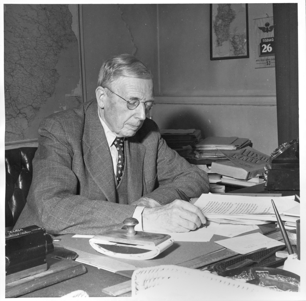 Titel: Byråchef Erik Malmkvist på sitt tjänsterum vid pensionsavgången.