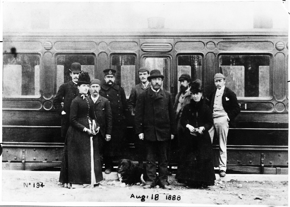 Tjänstemän med flera under engelsmännens tid vid salongsvagn i Sandträsk. Sverige & Norge Järnväg, S&NJ Personvagn 1.