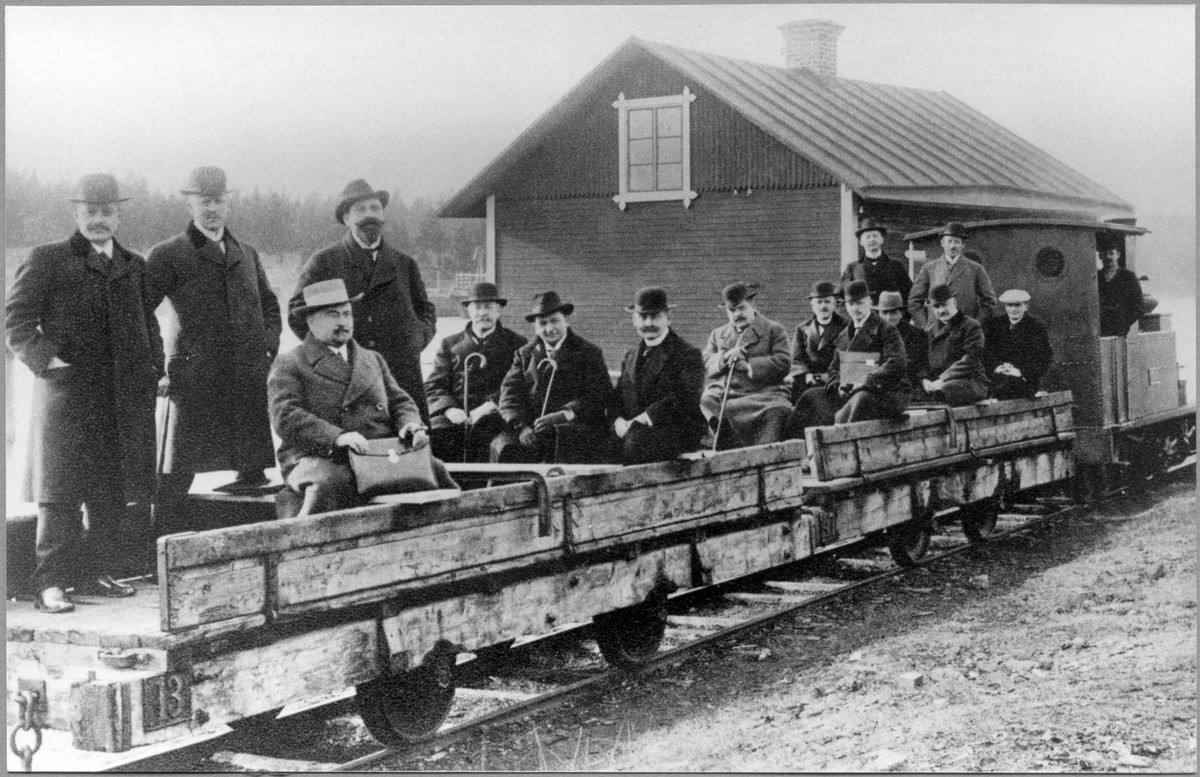 Titel: Holmens Bruk AB styrelse med gäster på Skebobanans flakvagnar.