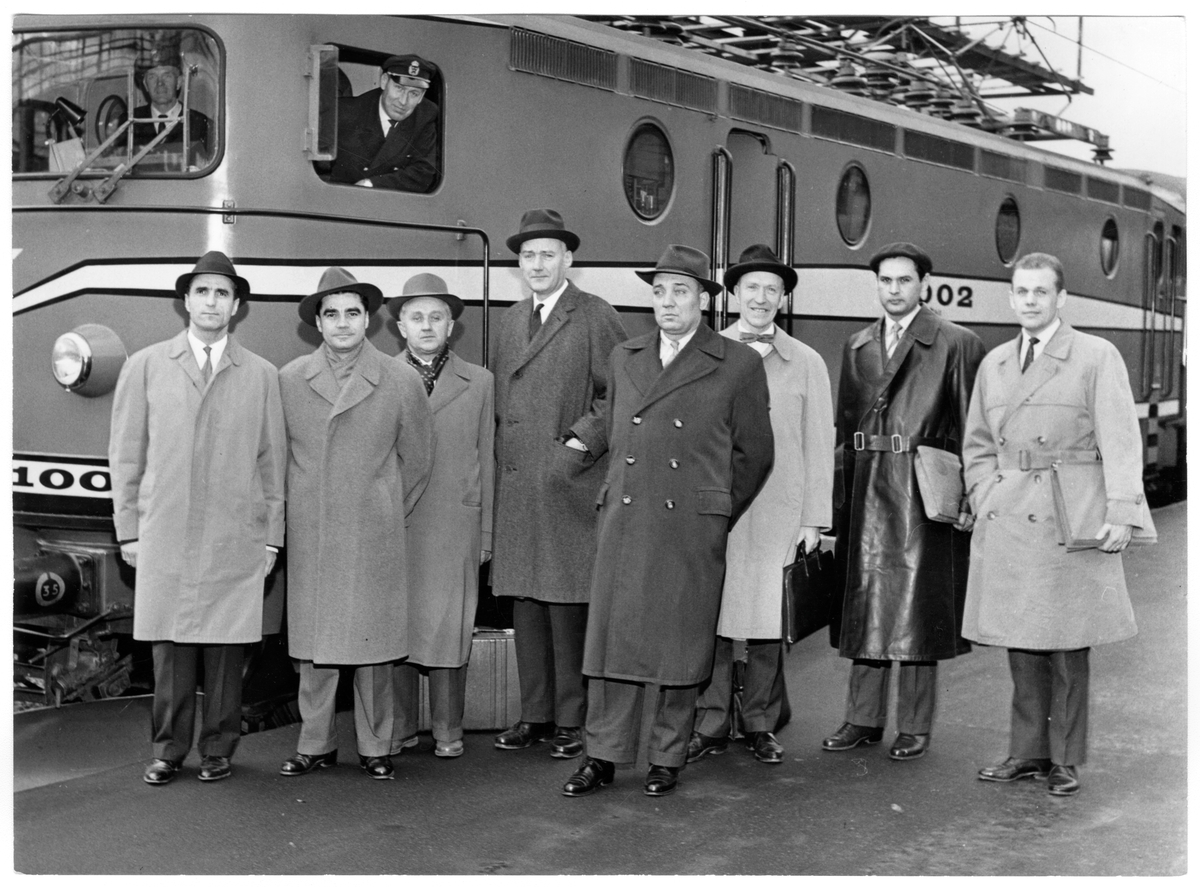 Utländskt besök vid Statens Järnvägar. Bakgrunden Statens Järnvägar, SJ Rb 1002.