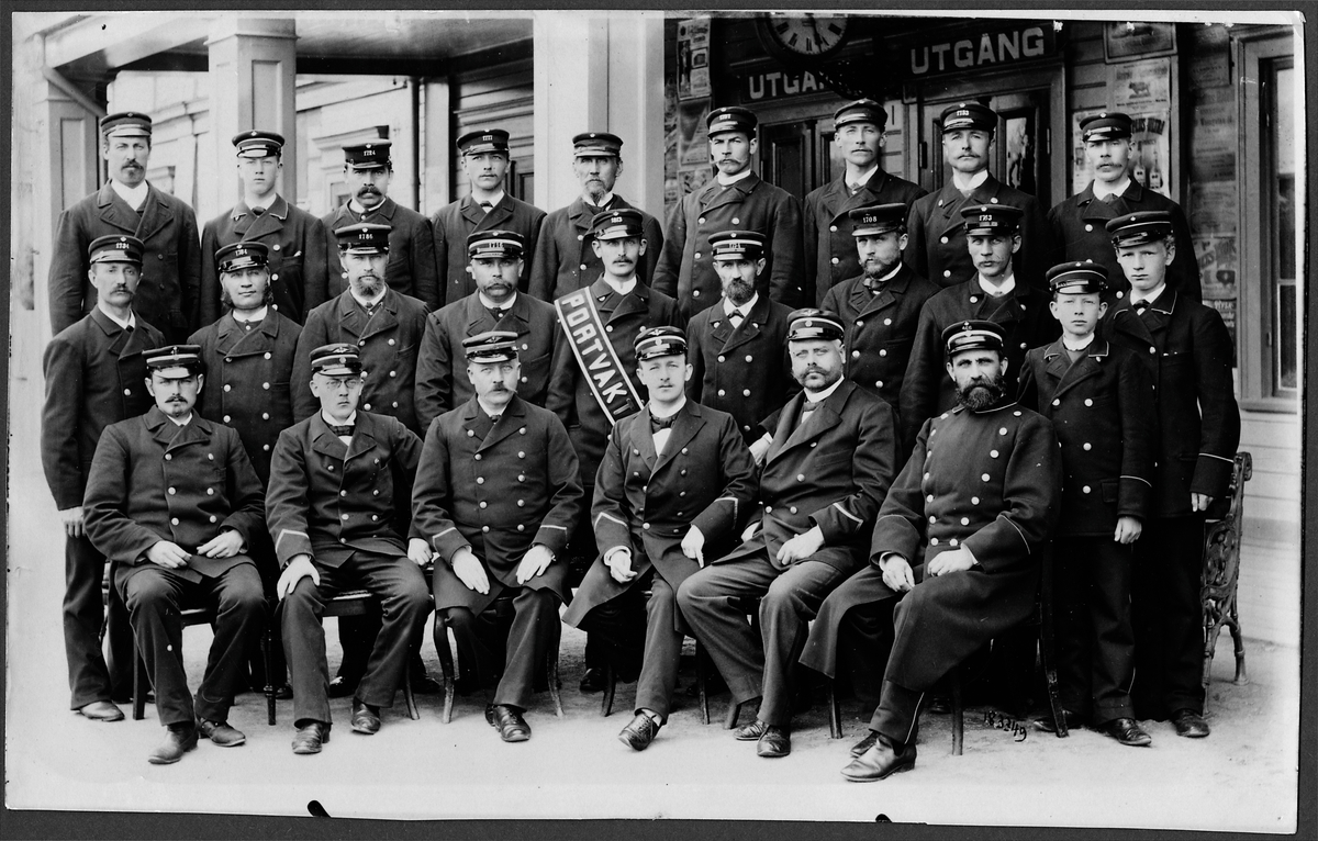 Personal vid Statens Järnvägar, SJ uppställda utanför stationshuset i Sundsvall.