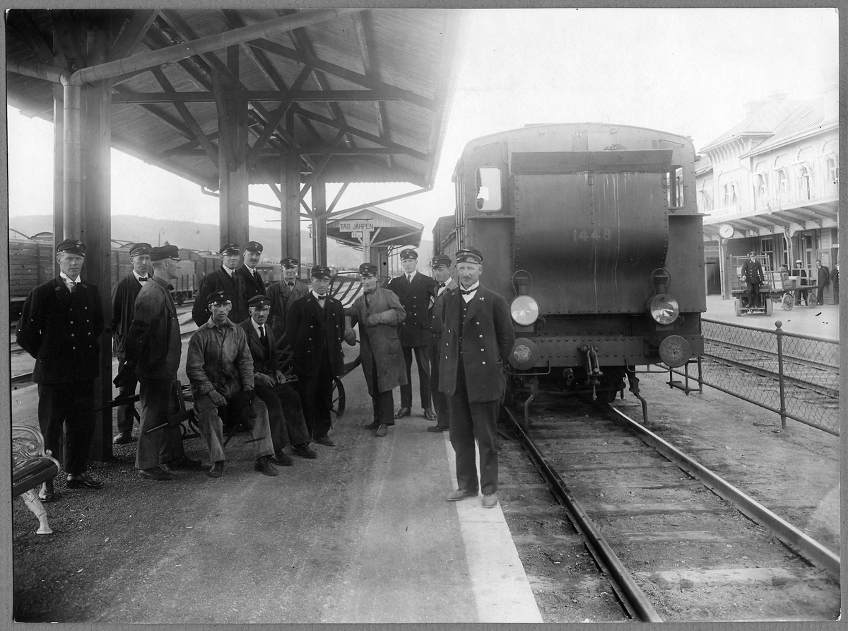 På Östersunds centralstation står växelpersonal och Statens Järnvägars ånglok N 1448.