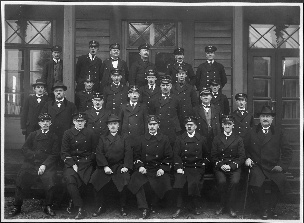 Uniformerad personal framför stationshuset vid Stockholm Södra station.