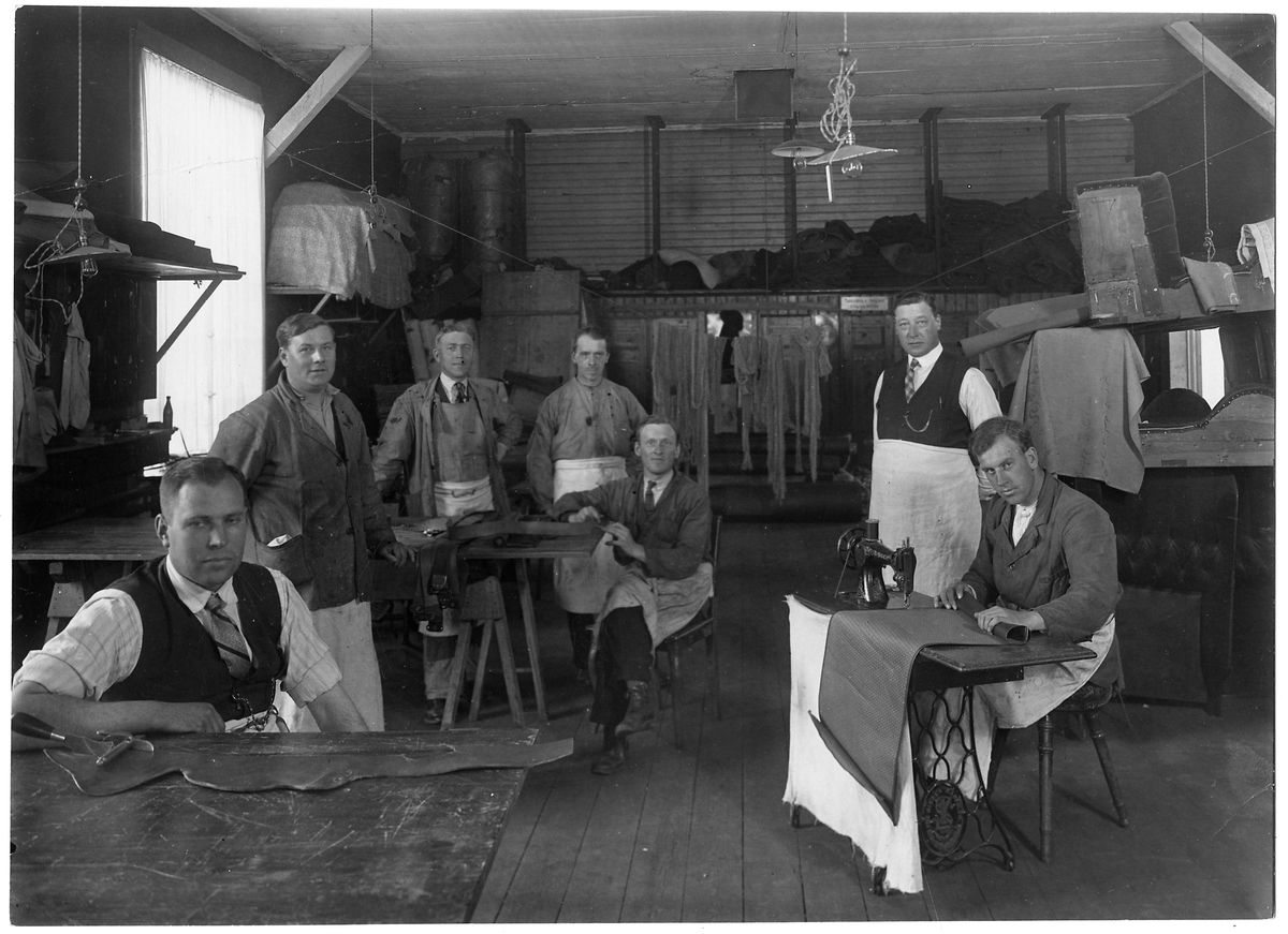 Verkstadsarbetare på tapetserareverkstaden vid Tomteboda station.