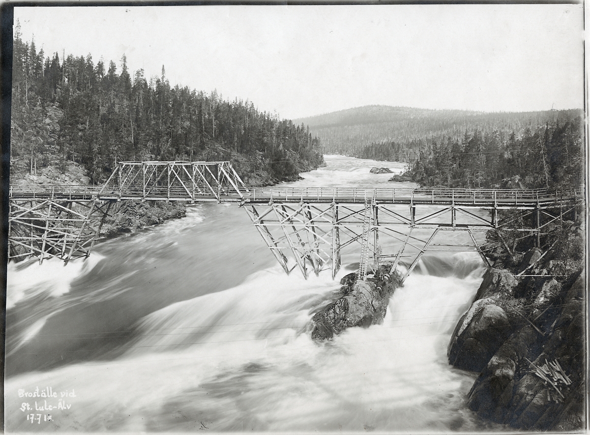 Provisorisk bro över Stora Luleälven alldeles ovanför den järnvägsbro som höll på att byggas längs Inlandsbanan. I bakgrunden skymtar Porjusberget.