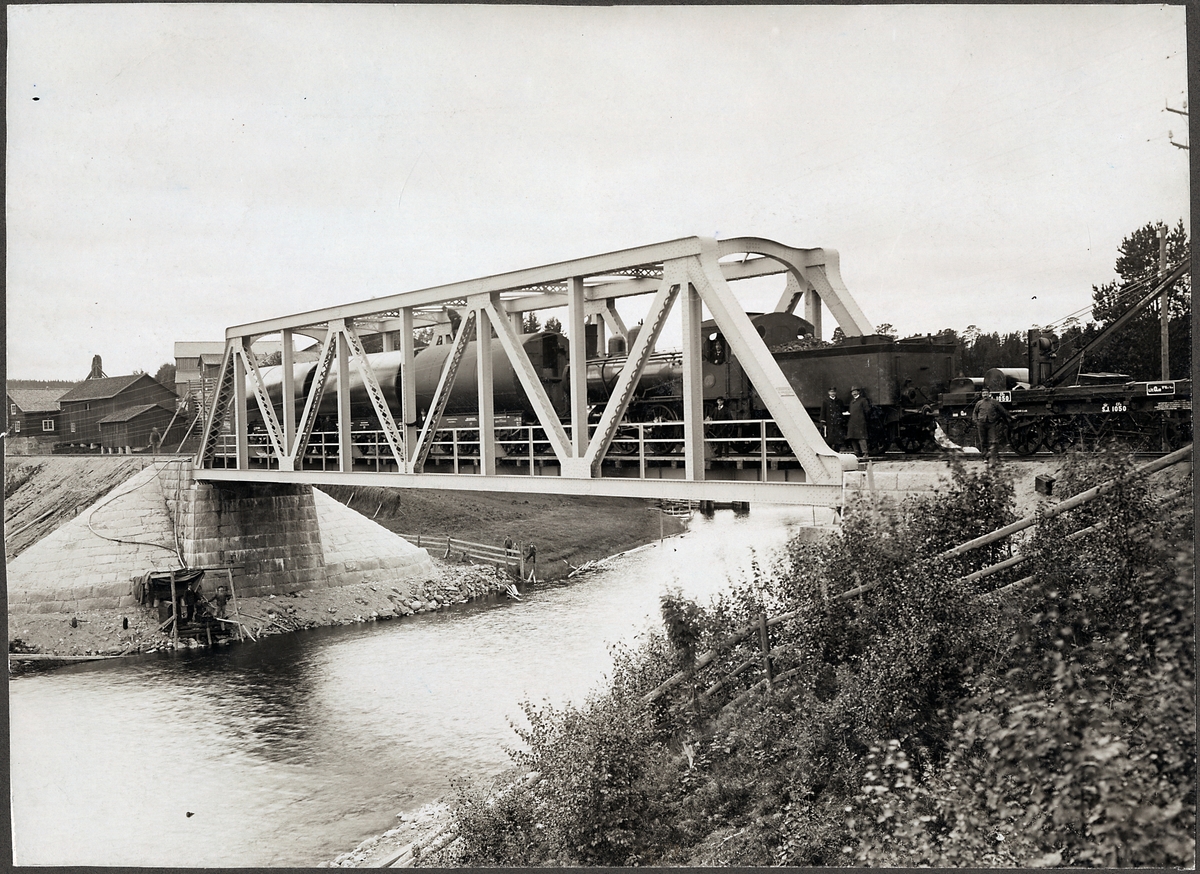 Järnvägsbron över Moälven på linjen mellan Mellansel och Vännäs, provbelastning med loket Statens Järnvägar, SJ L 838 och godsvagnarna Statens Järnvägar, SJ Q 1043 och SJ Q 1050.