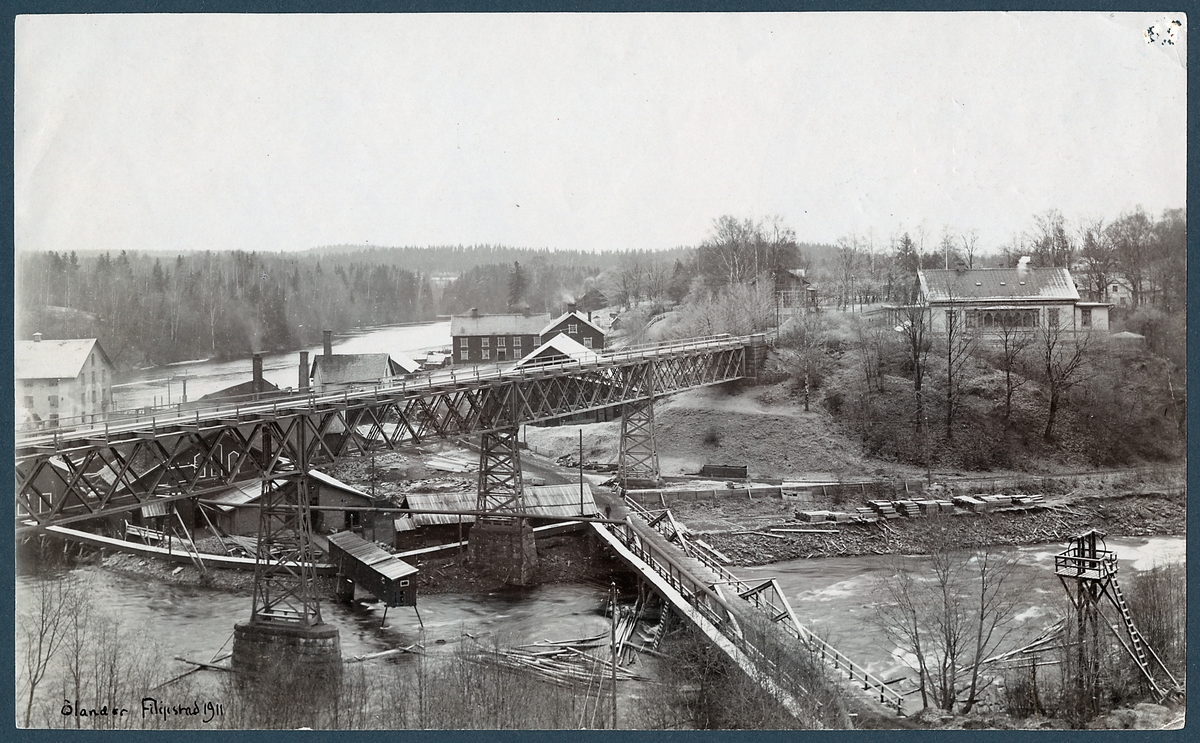 Järnvägsbro över Norsälven. Den vita byggnaden till vänster är kvarnen och till höger om denna smedjor tillhöriga Edsvalla bruk, Nors Jernverks AB.
