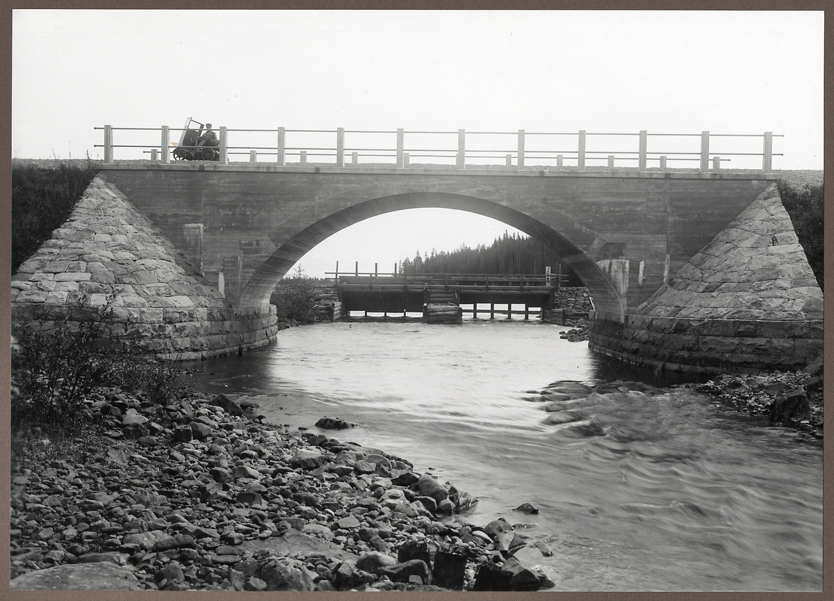 Järnvägsbro över Horrmundsvallen och vägbron i bakgrunden.