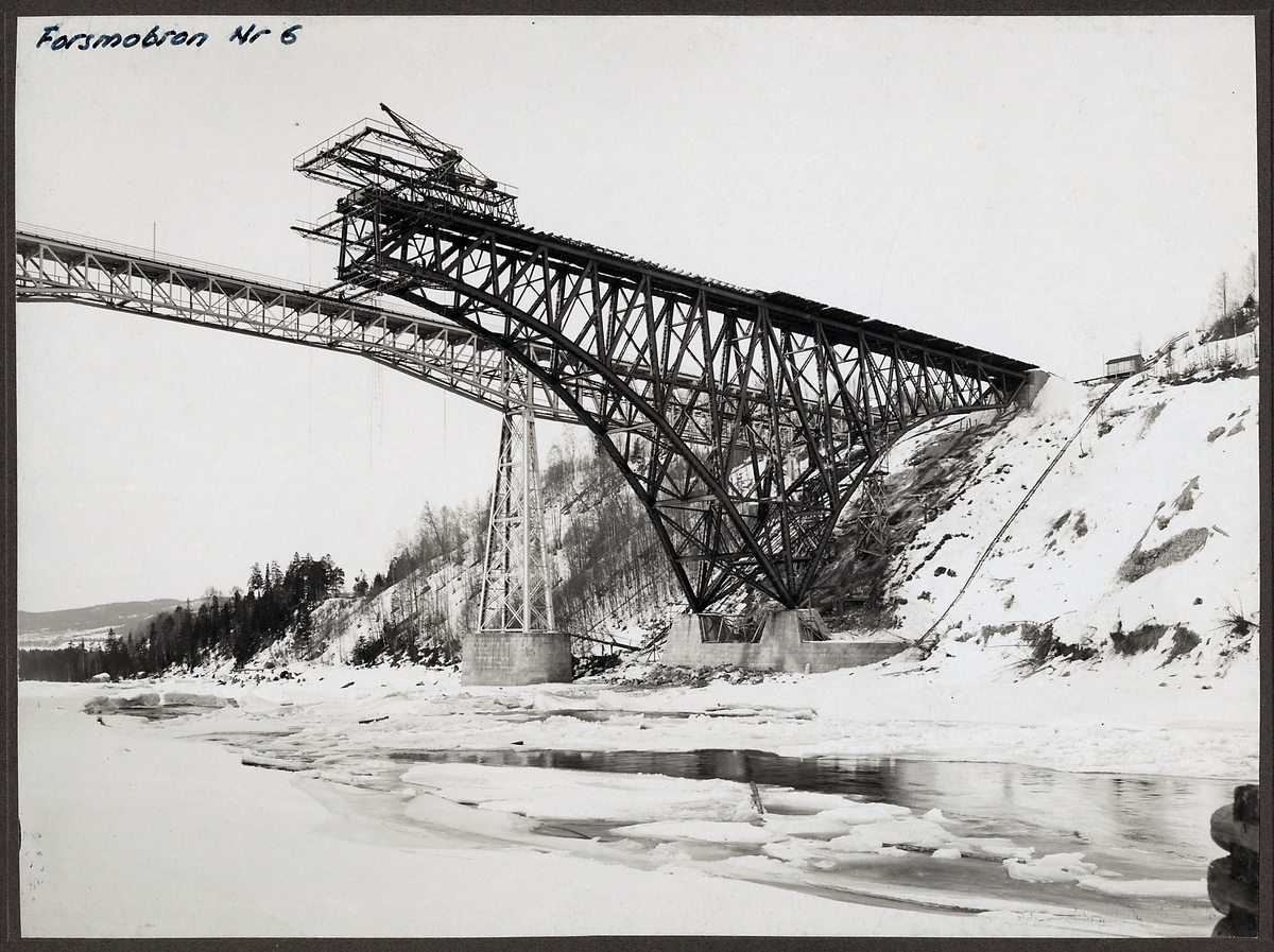 Titel: Brobygge av järnvägsbron över Ångermanälven vid Forsmo. Äldre bro syns bakom.