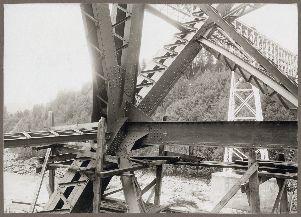 Brobyggnation av den järnvägsbron över Ångermanälven vid Forsmo.