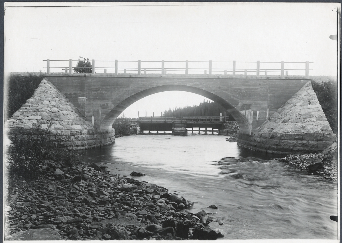 Järnvägsbro över Horrmundsvallen och vägbron i bakgrunden.