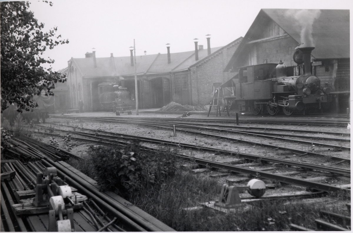 Halmstad-Bolmens Järnvägs, HBJ lokstall, med lok Halmstad - Bolmens Järnväg, HBJ 5 "Halland" utanför lokstallet.
