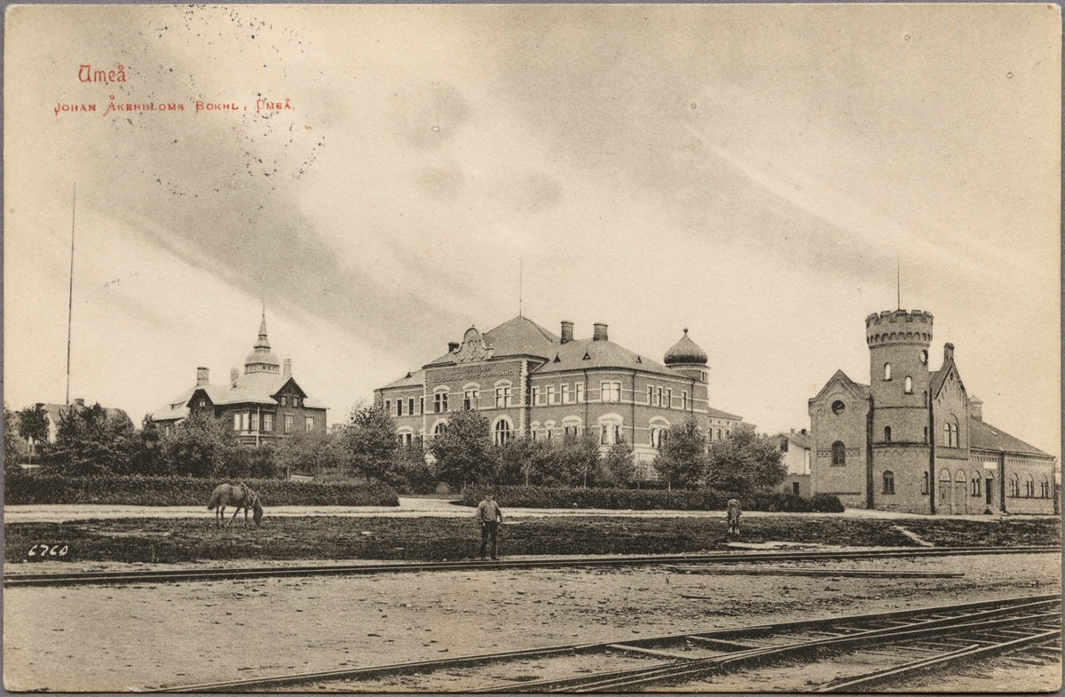 Bankbyggnad och elverk vid järnvägslinje i Umeå.