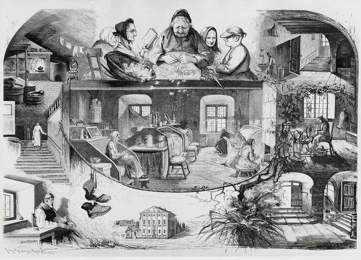 Lillienhoffska huset. Exteriorbild längst ned i mitten Stockholm Södra stationshus skymtar i bakgrunden. ( t.h.) Hos de fattiga. Skissen från Katarina fattighus. Tecknad av Jenny Nyström och Ingeborg Westfeld.