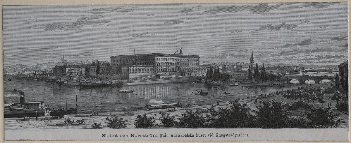 Slottet och Norrström (från Adelskoldska huset vid Kungsträdgården.) Träsnitt år 1888.