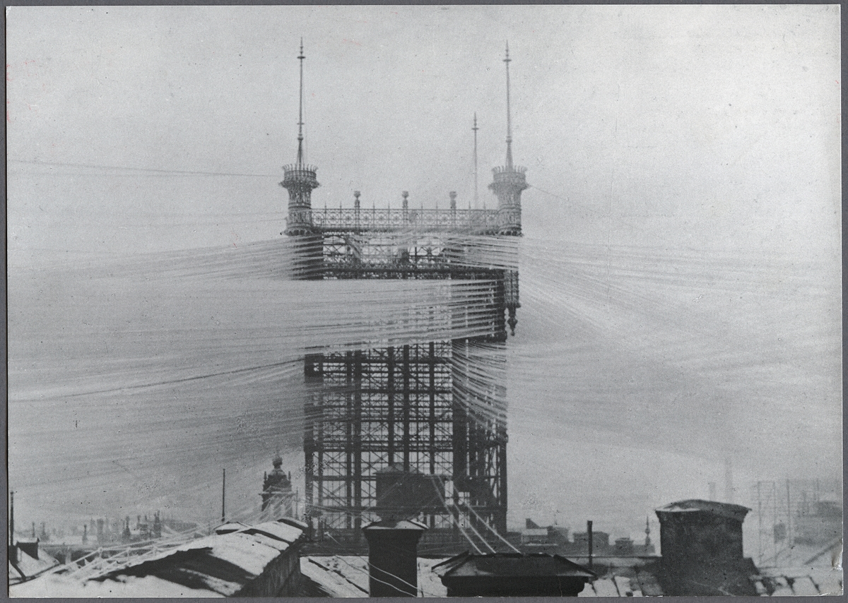 Telefontornet i rimfrost, slutet av 1800-talet. På taket till den nya telefonstationen vid Malmskillnadsgatan i Stockholm byggdes 1886 ett jättestort torn i järn. Därifrån gick 4000 telefontrådar ut över hustaken i staden. Stationen var världens största i sitt slag och Stockholm den telefontätaste staden i världen vid den här tiden. Telefontornet stod kvar till 1953 då det måste rivas efter en eldsvåda. Tornet brann den 23 juli 1952.