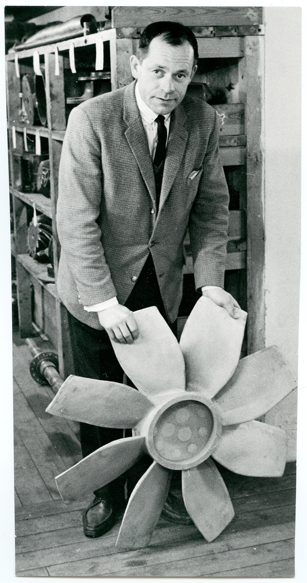 Almkvist vid inköpssektionen på Trafikaktiebolaget Grängesberg–Oxelösunds Järnvägar, TGOJ visar upp en propeller.