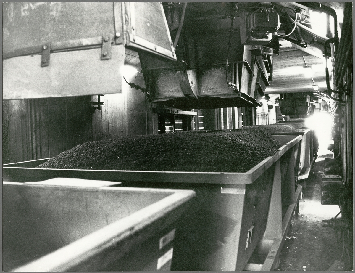 Påfyllning av vagnar på transportbandet i Oxelösunds hamn.