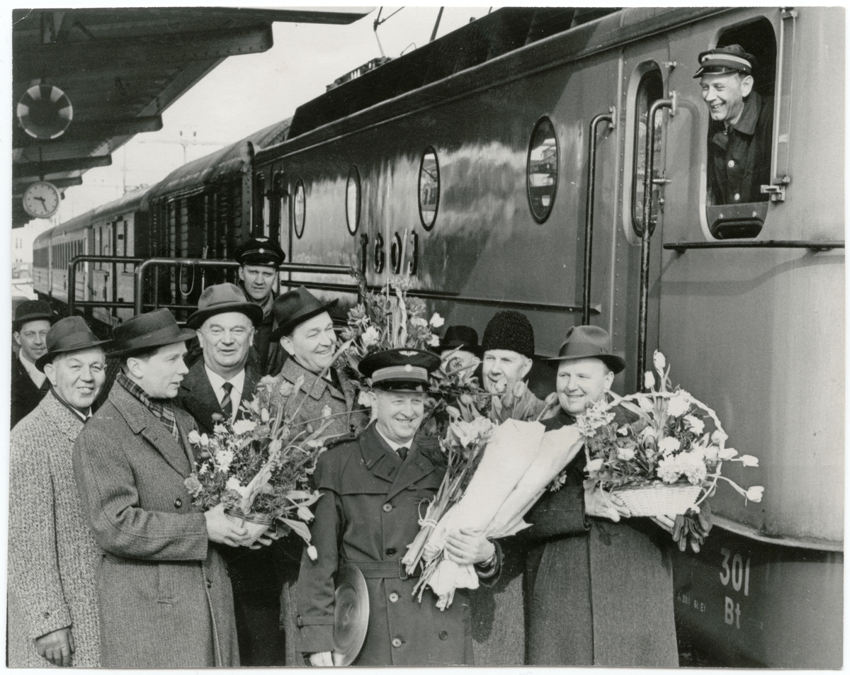 Uppvaktning av Georg Karlsson med Trafikaktiebolaget Grängesberg - Oxelösunds Järnvägar, TGOJ Bt 301 i bakgrunden.