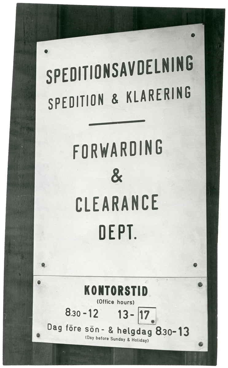 Skylt med öppettider för godsexpeditionen på Oxelösund station.