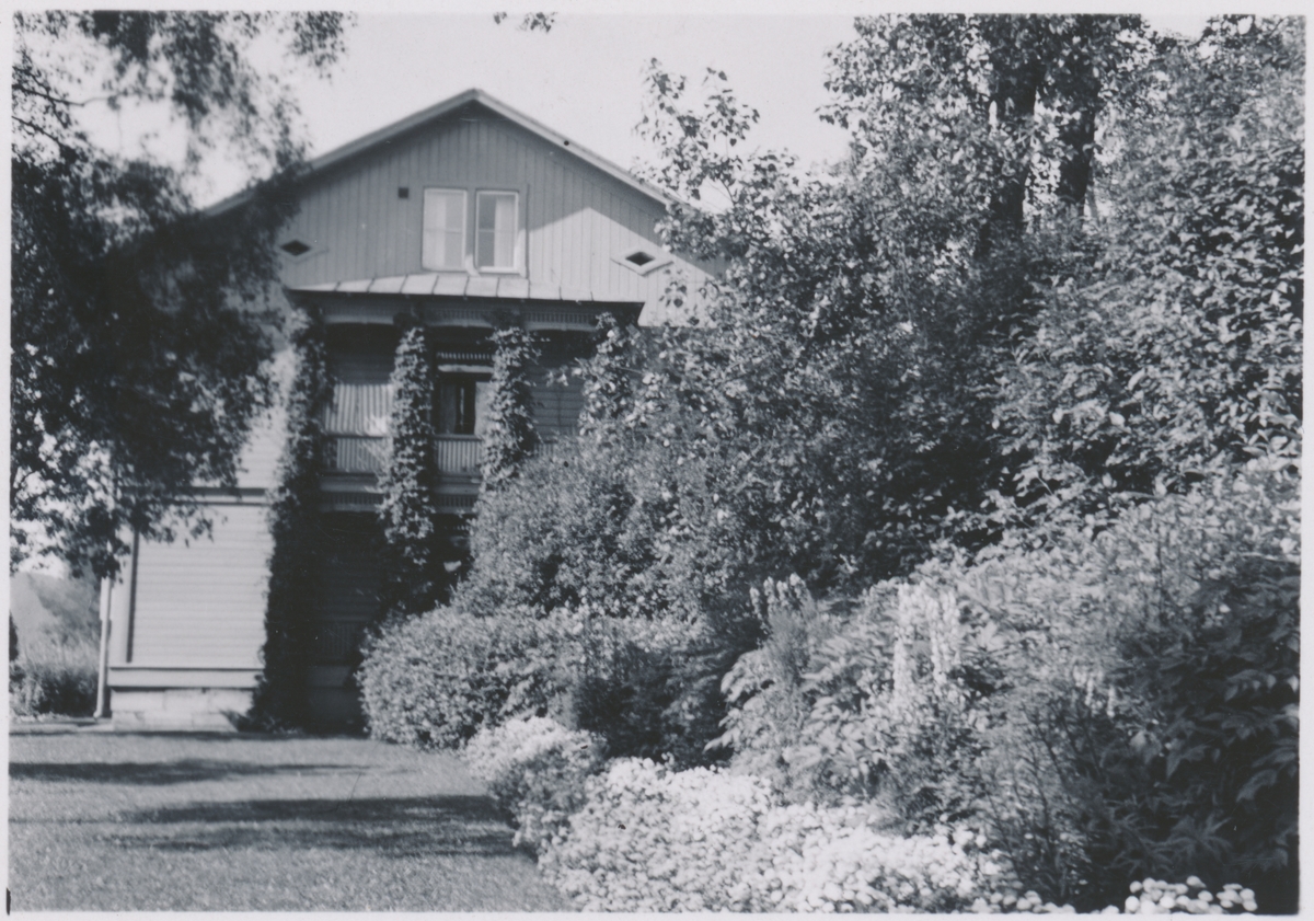 Trädgård med humle och perenn.