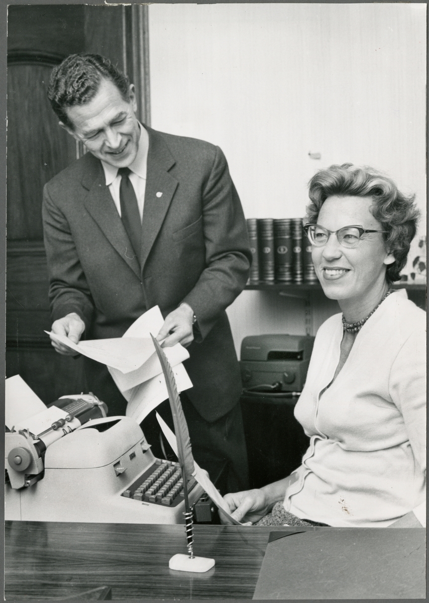 Kvinna och man vid skrivmaskin vid Gränges huvudkontor.