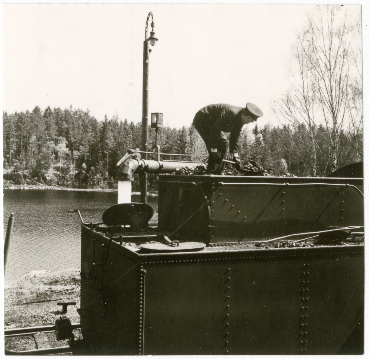 Titel: Vattenpåfyllning i ett ånglok från Trafikaktiebolaget Grängesberg – Oxelösunds Järnvägar, TGOJ.