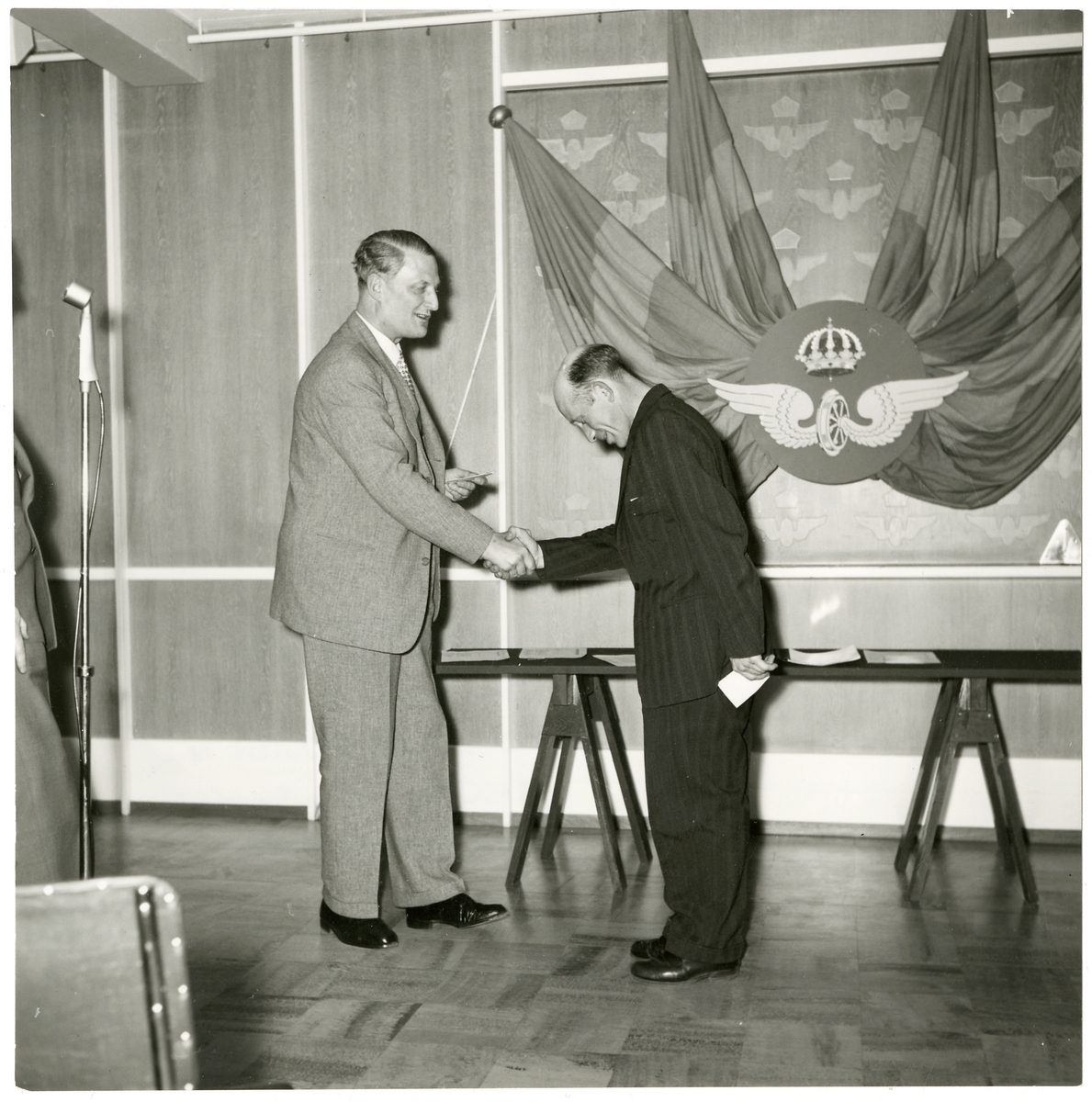 Titel: Generaldirektör Erik Upmark skakar hand med Einar Pettersson.