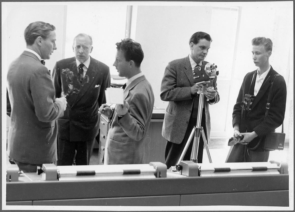 Gruppfoto av Trafikaktiebolaget Grängesberg–Oxelösunds Järnvägar, TGOJ personal samt journalist och fotograf.