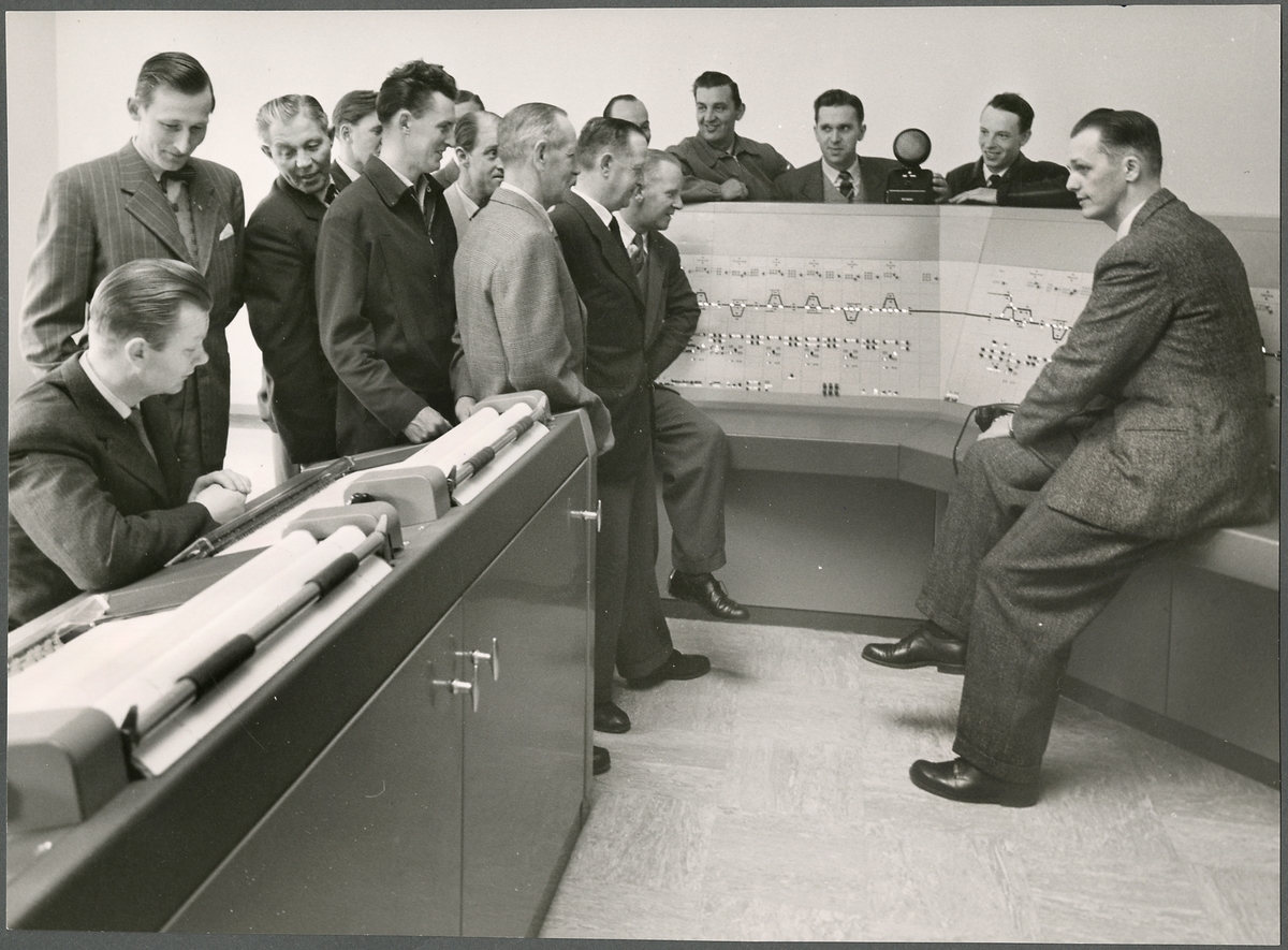 Gruppfoto vid Trafikaktiebolaget Grängesberg–Oxelösunds Järnvägar, TGOJ fjärrställverk.