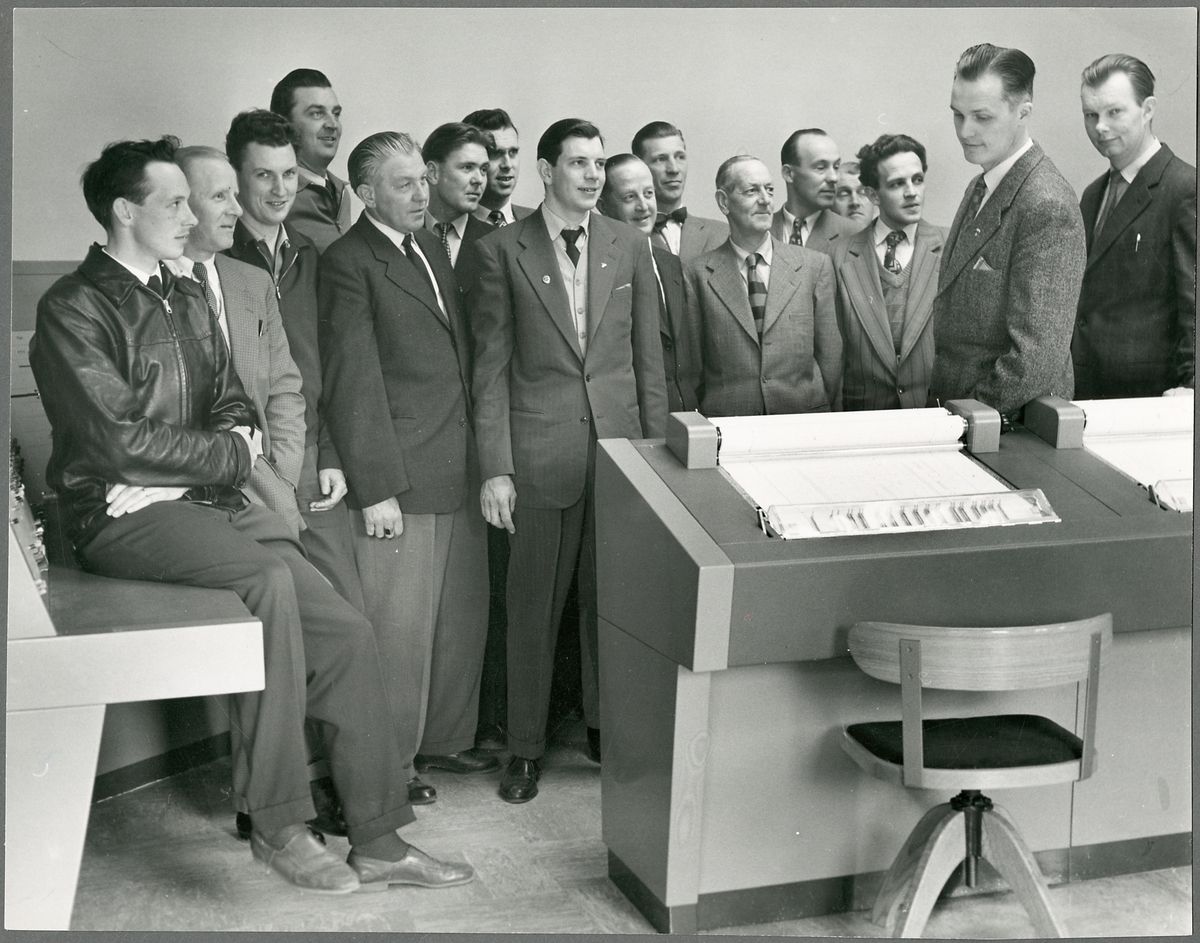Gruppfoto vid Trafikaktiebolaget Grängesberg–Oxelösunds Järnvägar, TGOJ fjärrställverk.