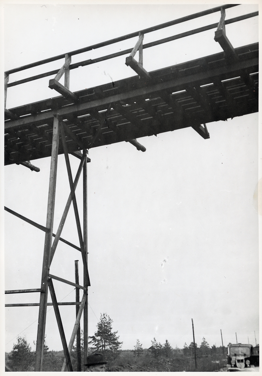 Toremosse torvfabriks smalspåriga järnväg passerar på en bro över Uddevalla - Vänesborg - Herrljunga Järnväg, UVHJ, i närheten av lastplatsen Flo mosse