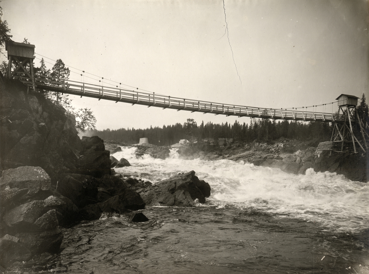 Provisorisk gångbro, Åkvisslan vid Fjällsjöälven. Sveriges statsbanor järnvägsbyggnad Forsmo-Hoting. Arbetet med brostöden påbörjades i början av 1922 och slutfördes i september samma år.