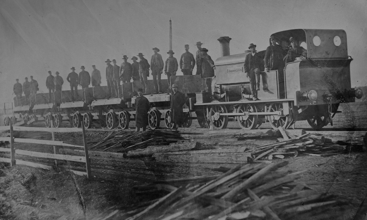 Byggnad av hamnbanan i Sarpsborg. Ånglok "Borregaard" levererat till Borregaard AB 1891.