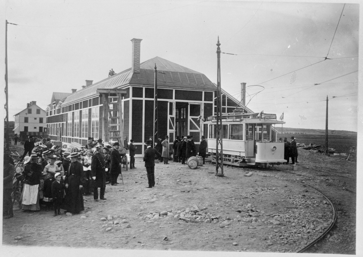 Åskådare vid Uppsala Spårvägar, US spårvagn 2 utanför vagnhallen.