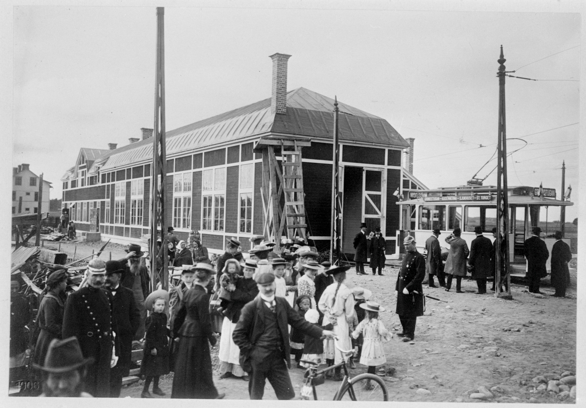 Åskådare vid Uppsala Spårvägar, US spårvagn 2 utanför vagnhallen.