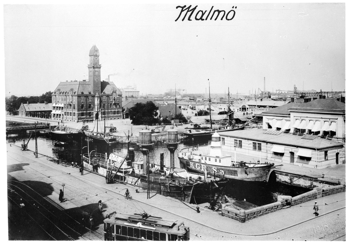 Bilden tagen från Norra Vallgatan på Tornhuset vid Bagersplats. Till vänster i bild ses Hjälmarbron. Malmö Stads Spårvägar, MSS spårvagn på linje 2 på spåret framför stationen. Ett fyrskepp ligger vid kaj.