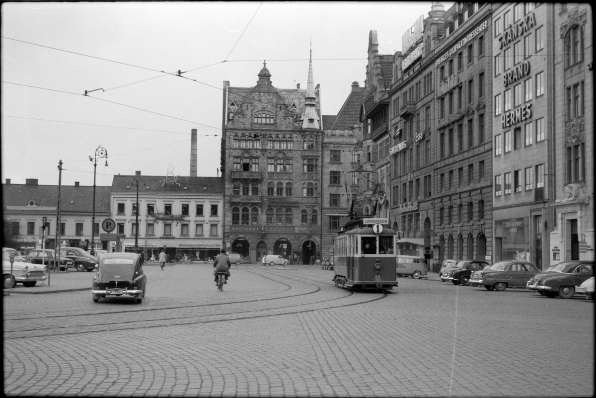 Personbil, cyklist och Malmö Stads Spårvägar, MSS F 20 i trafik på Stortoget i Malmö.