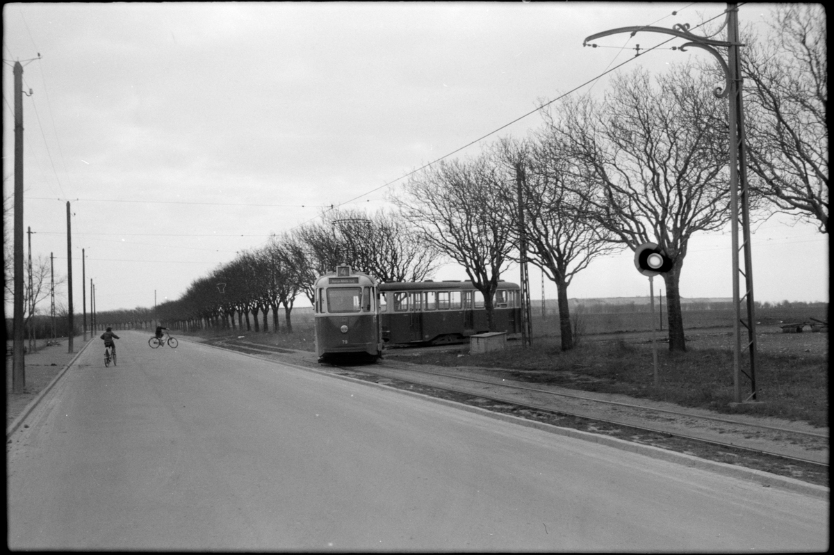 Malmö Stads Spårvägar, MSS G nr 79 "mustang" med släpvagn i trafik vid slingan i Sibbarp på linje 4 mot Gustav Adolfs torg.
