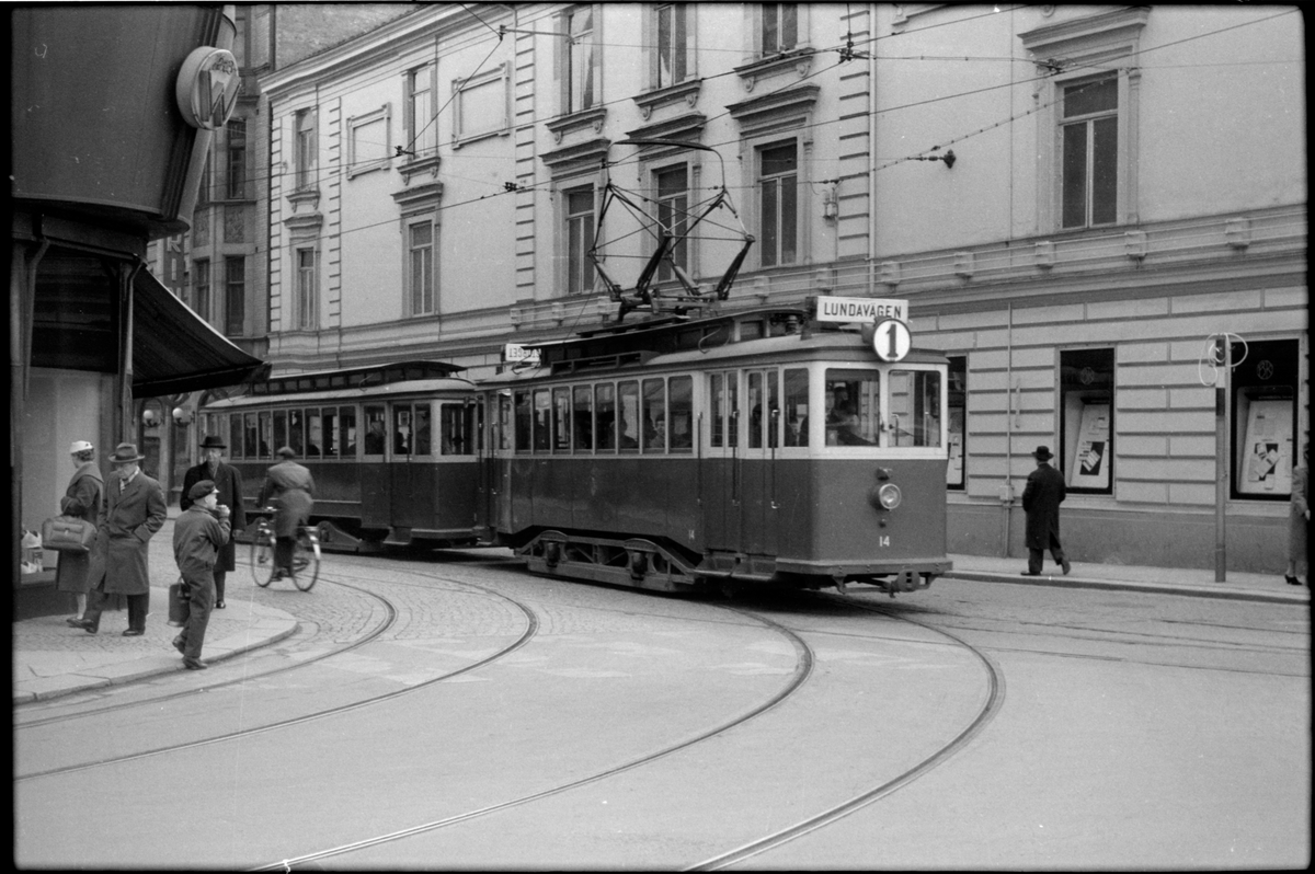 Malmö Stads Spårvägar, MSS F 14 med släpvagn i trafik utanför "Wesselshuset" på Stora Nygatan in på Södergatan linje 1 mot Lundavägen.