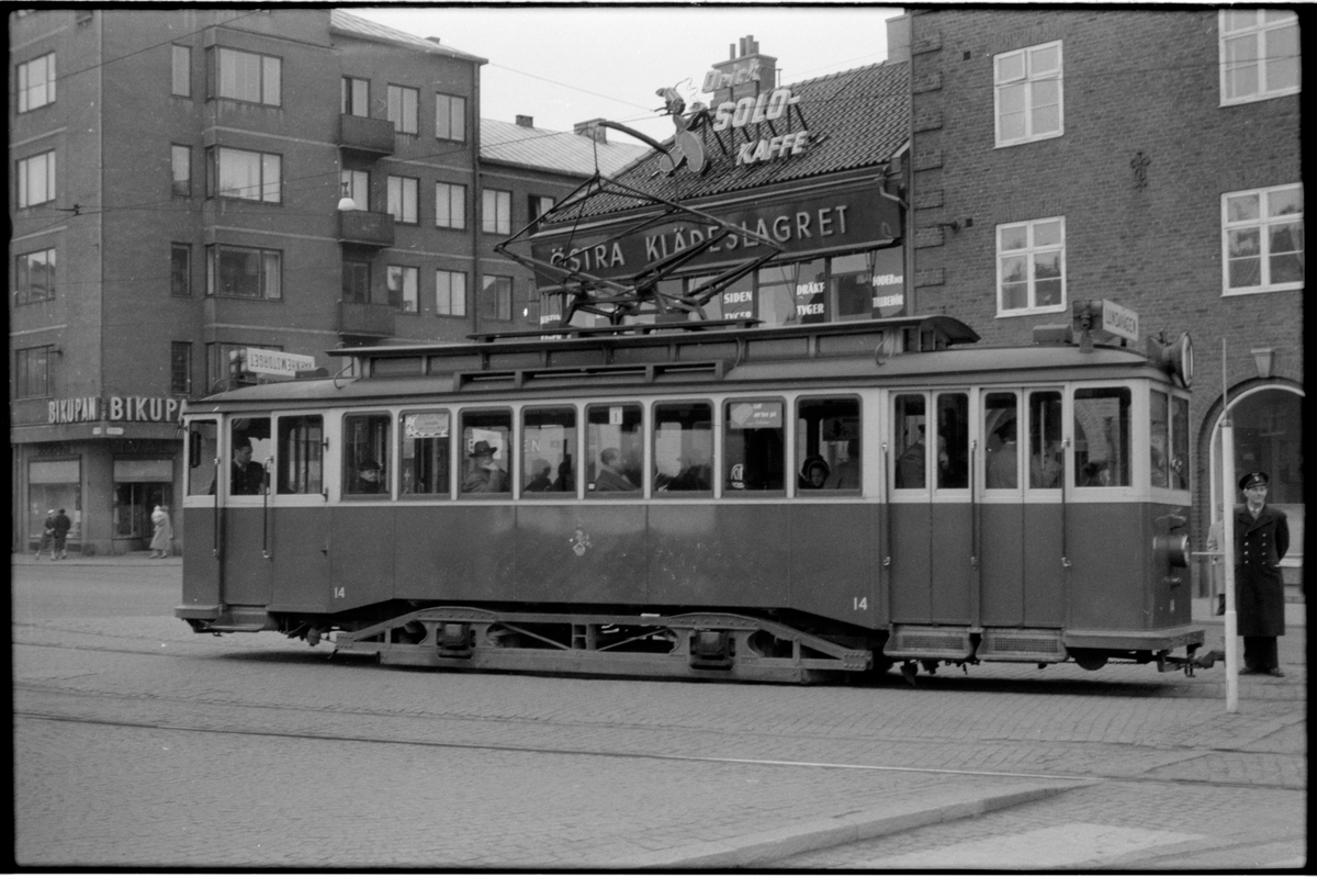 Vid hållplats på Östra Förstadsgatan vid Värnhemstorget står Malmö Stads Spårvägar, MSS EF 14.
