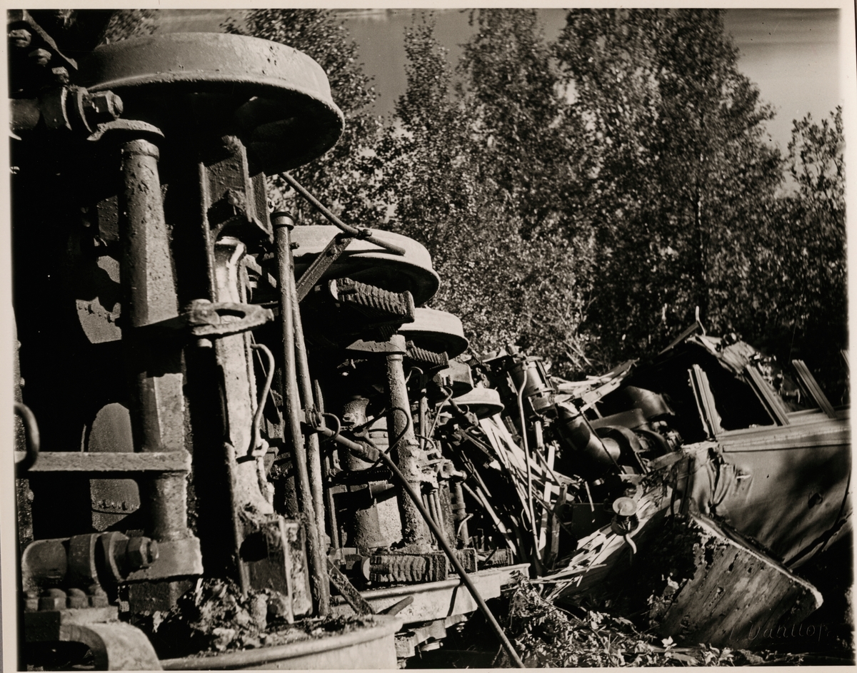 Statens Järnvägar, SJ Oe 74 och SJ Oe 75 har vält och ligger utanför spåret efter jordskred i närheten av Straumsnes på linjen mellan Riksgränsen och Narvik augusti 1937.