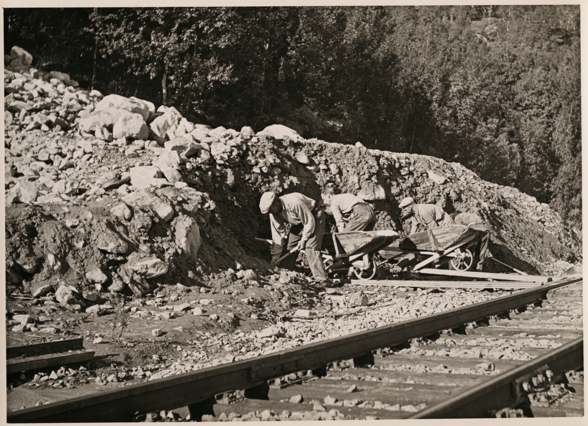Röjningsarbete efter jordskred i närheten av Straumsnes på linjen mellan Riksgränsen och Narvik augusti 1937.