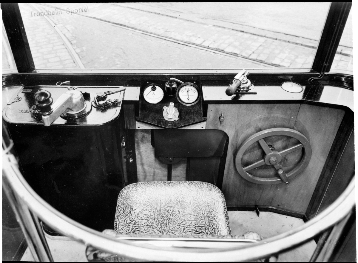 Interiören från förarplatsen på spårvagn tillhörande AS Graakalbanen i Trondheim.