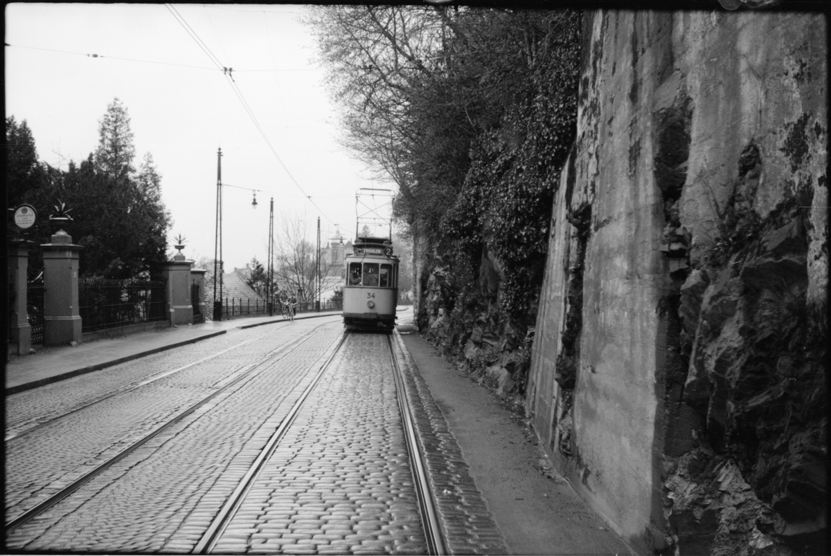 Bergen Sporvei Aktieselskabet, BS spårvagn 34 i trafik på Kalvedalsveien på linje 2 - Fridalen.